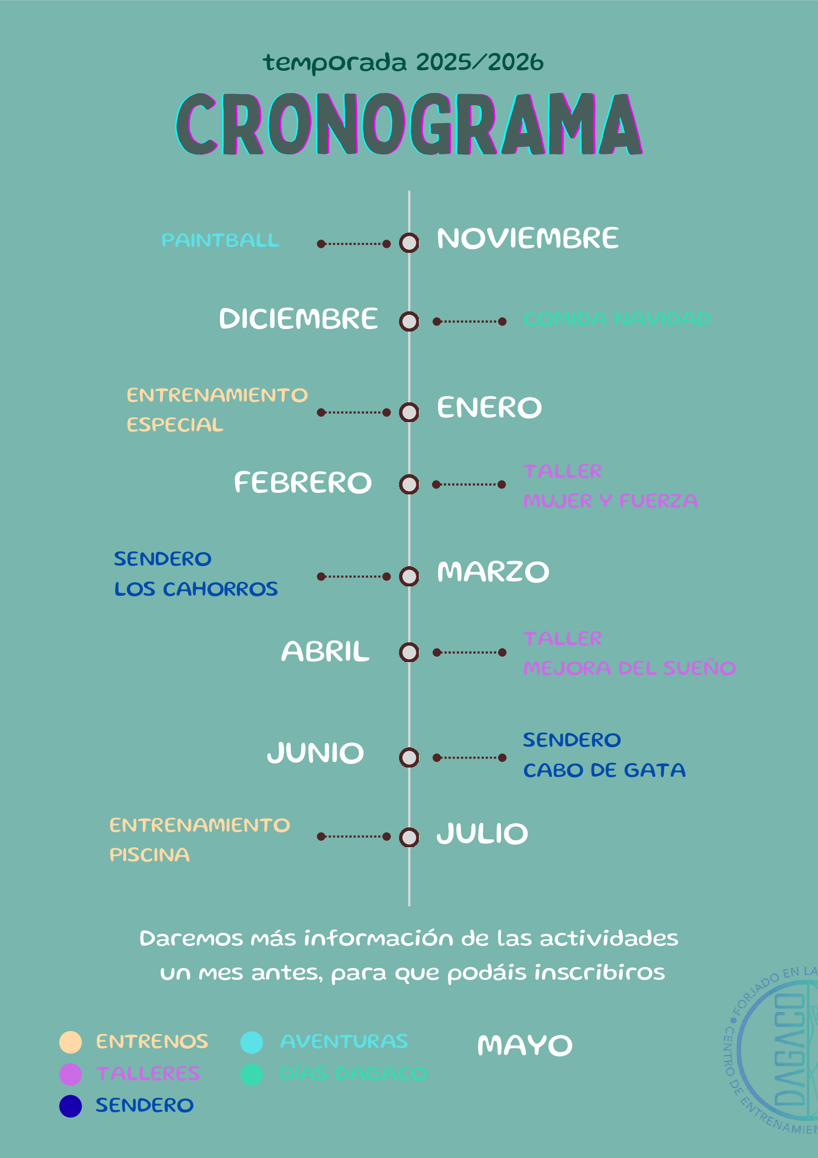 En DAGACO ya tenemos todo preparado para una nueva temporada cargada de deporte, diversión y compañerismo. Nuestro cronograma 2025/2026 llega repleto de actividades para todos los gustos: desde entrenamientos especiales hasta rutas de senderismo, talleres temáticos y eventos al aire libre.